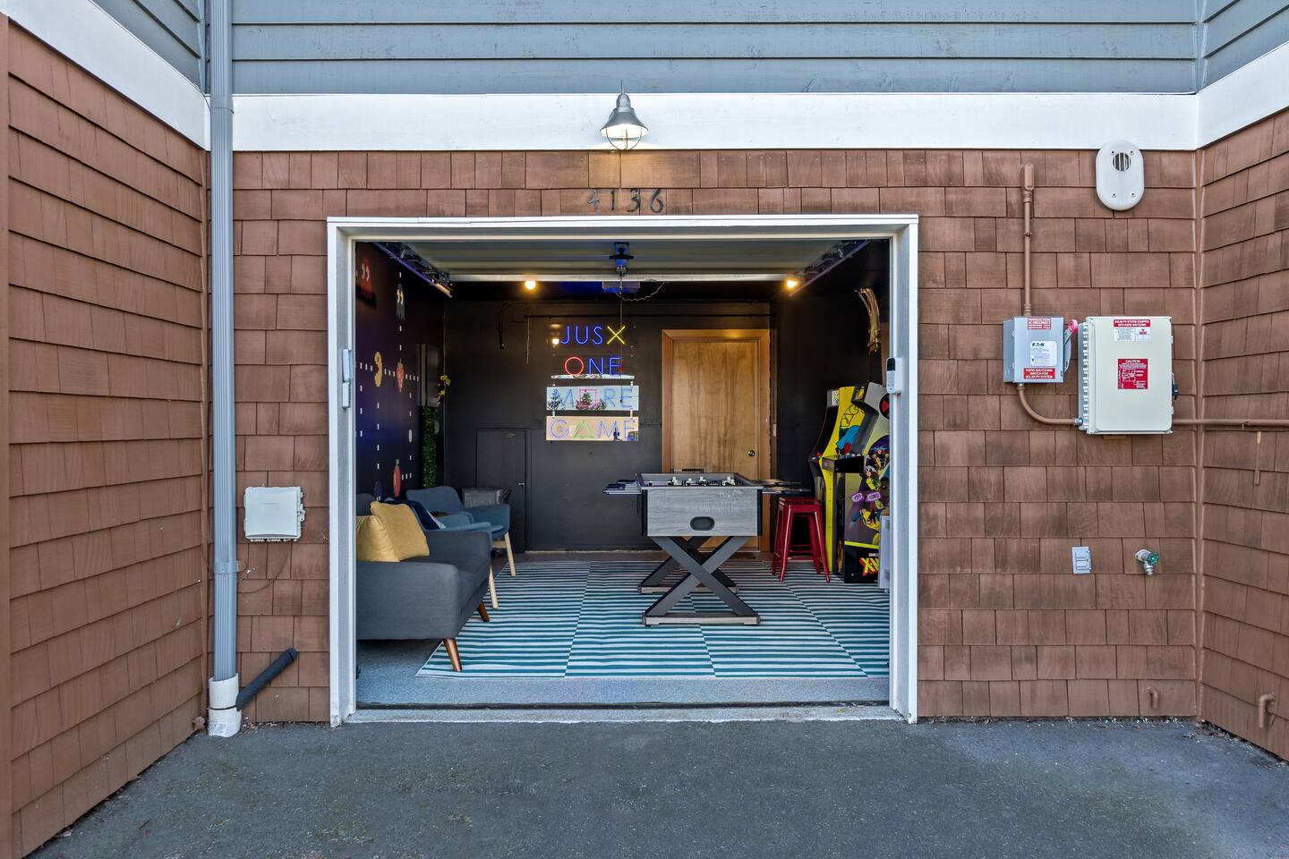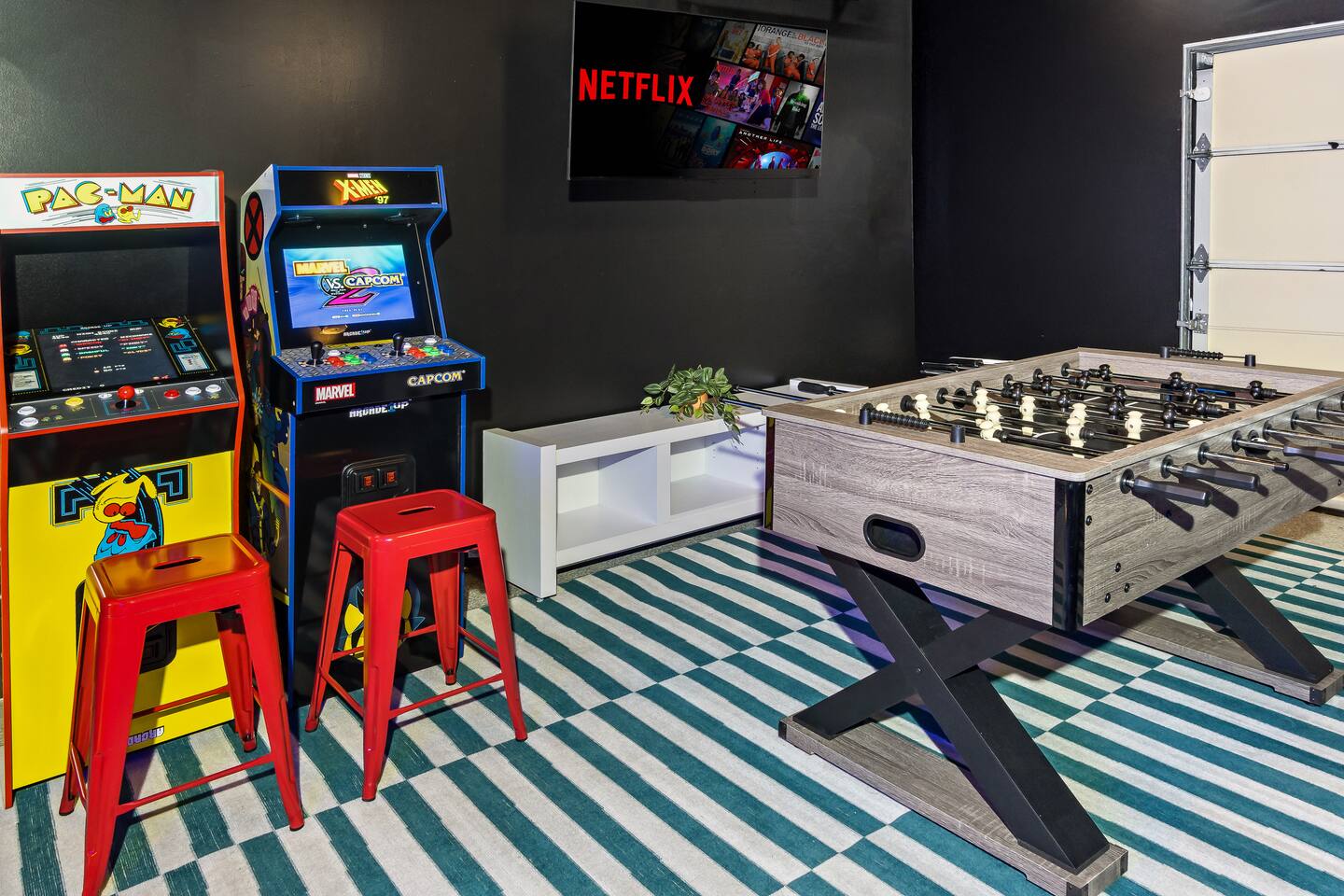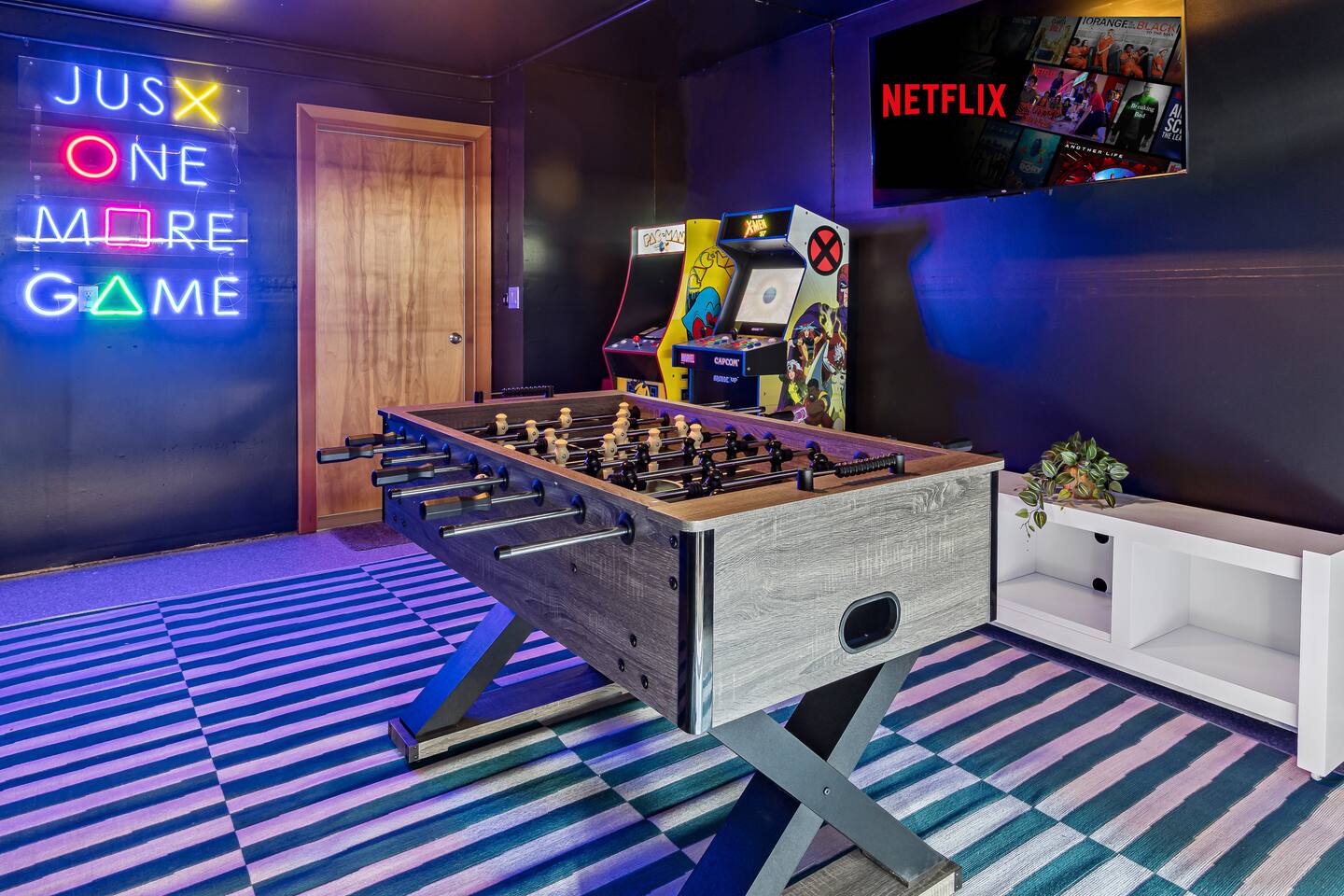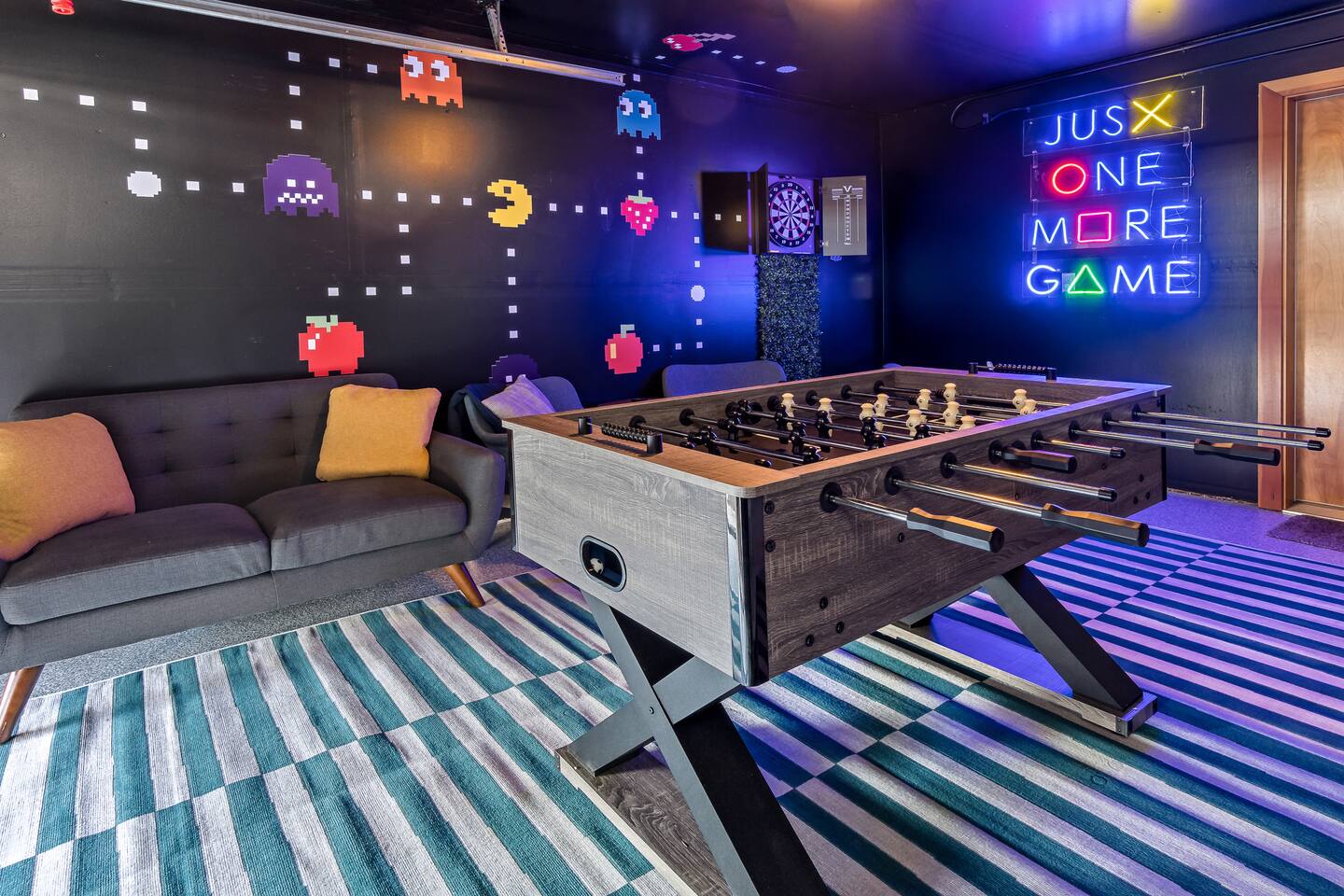 Welcome to Westside Den!!! Step back in time and enjoy some friendly competition in this retro-themed game room. Featuring a foosball table, a dartboard, and a vintage arcade vibe, this space is perfect for family fun or a night out with friends.